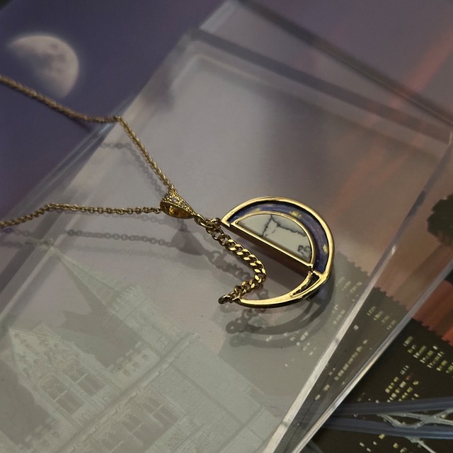 【Nocturne(ノクターン)series】 夜をテーマにした、感情の余韻を纏うアクセサリーシリーズ。 “美しさ”は、昼の中だけにあるわけじゃない。 静けさ、影、満ち引き、そして沈黙にも、芯を持った美がある。 このシリーズは、そんな夜の奥行きに焦点を当てる。 【Erebus|エレボス】 闇を抱く者 ギリシャ神話に登場する原初の闇の神。 光がまだ生まれる前、 静けさと混沌の狭間に立ち、 “何もないことの美”を知っていた存在。 彼の闇は恐怖ではなく、 すべてのものを包み込む始まりの器。 その深淵の中で、 新しい光が生まれることを知っている。 ― 闇の奥に、深い青の脈動を ― 商品説明 黒とサファイアブルーのコントラストが 夜の深みと静かな力強さを描くバイカラーチャーム。 外側の半円には深いブルーのアルコールインクを流し、 内側にはソーダライト風天然石の濃紺が沈む。 モチーフの端から、喜平チェーンが落ちるデザイン。 バチカンとチェーンは重厚感あるステンレスゴールドを採用し、 夜の静寂に潜む芯の強さを象徴する。 素材・サイズ ・トップ:約22mm(天然石+アルコールインクパーツ) ・石:天然石(ソーダライト風加工) ・チェーン:喜平サージカルステンレス/18KGPコート/全長 約38cm ・金具:ニッケルフリー 受注販売のため、石模様やインクの滲みは一点ずつ異なります。 あなただけの「闇の美しさ」を纏ってください。 SeleneとErebusは、 「光」と「闇」、そして「再生」をテーマにした双月のペア。 ひとつで装えば“夜の呼吸”を、 ふたつ並べれば“陰陽の調和”を感じるデザインです。