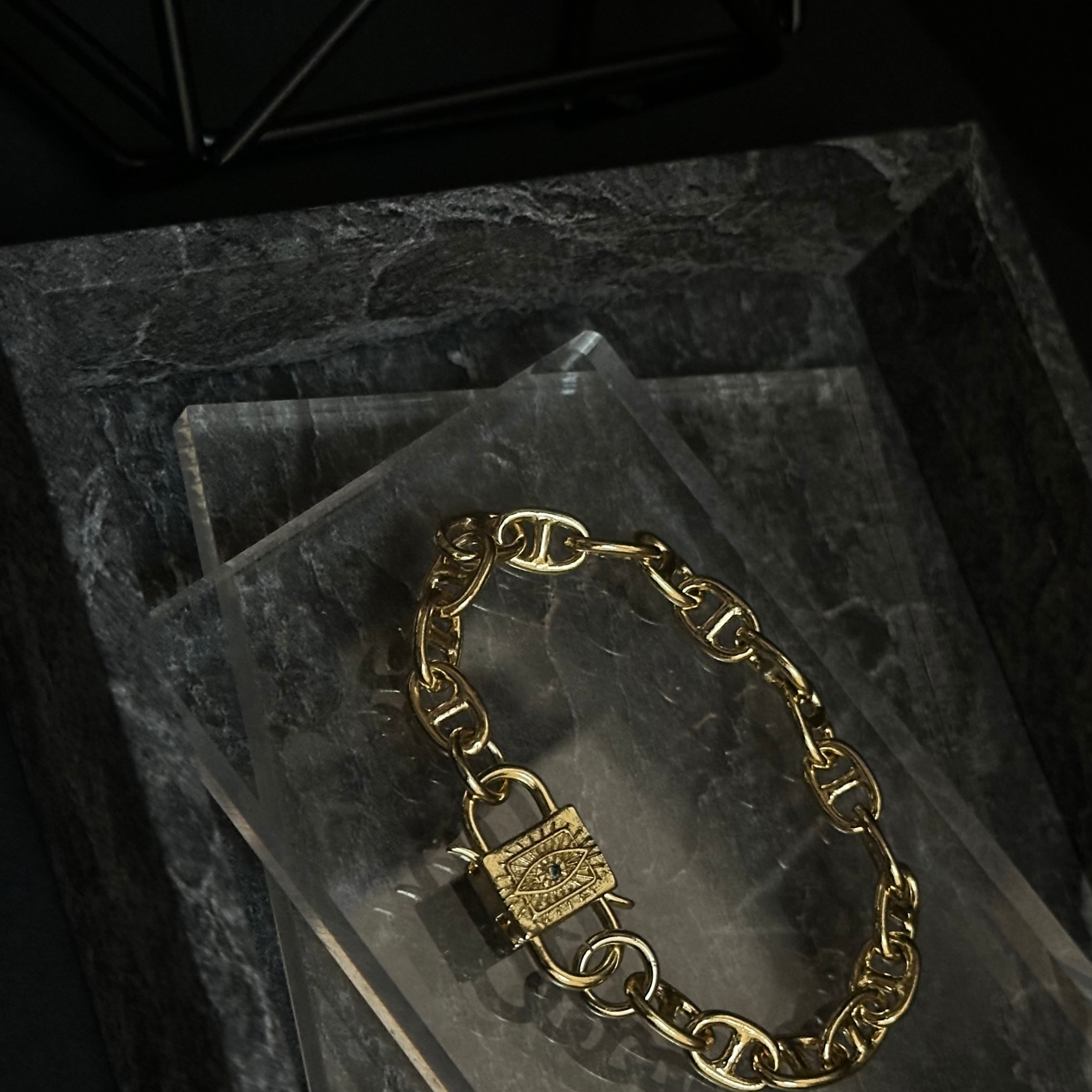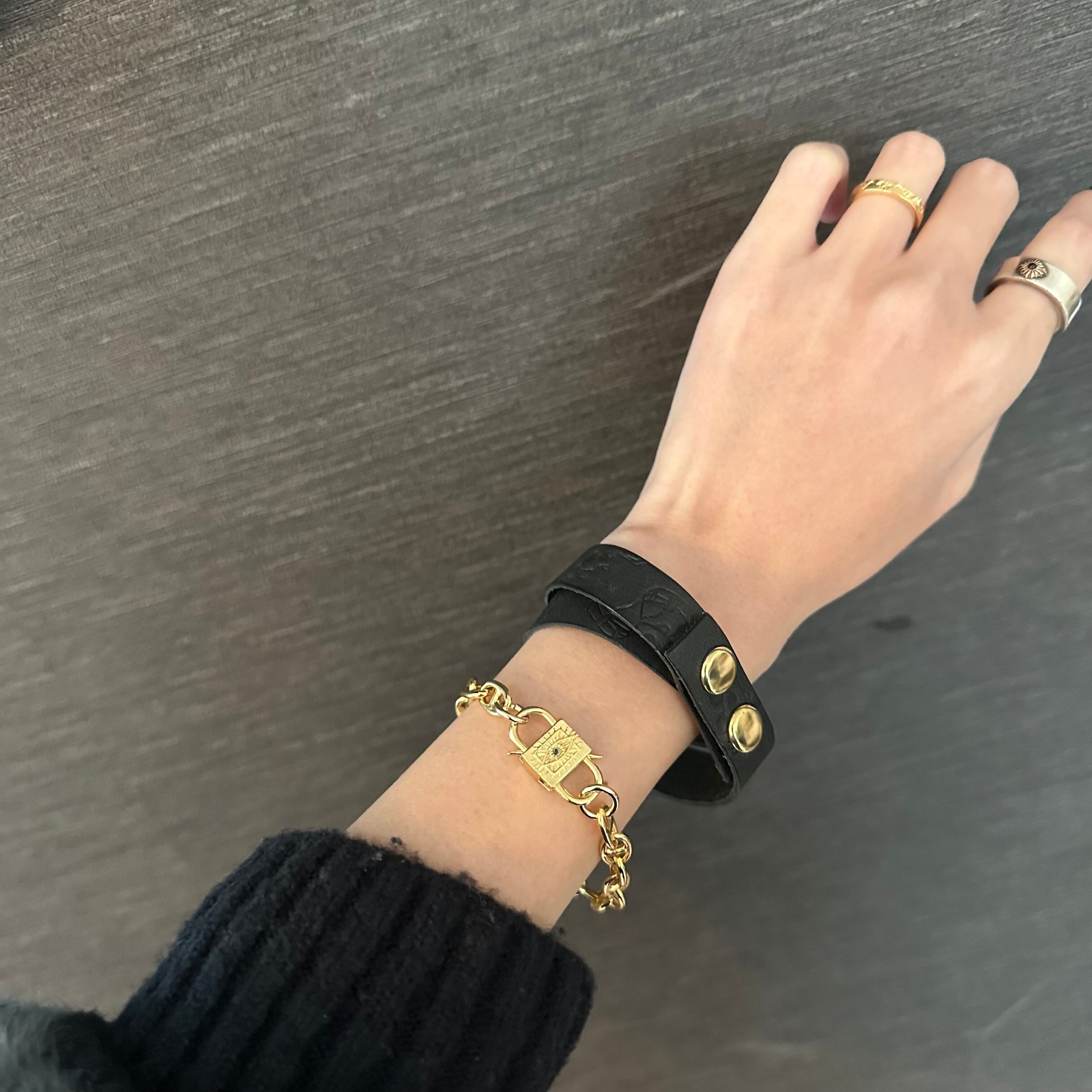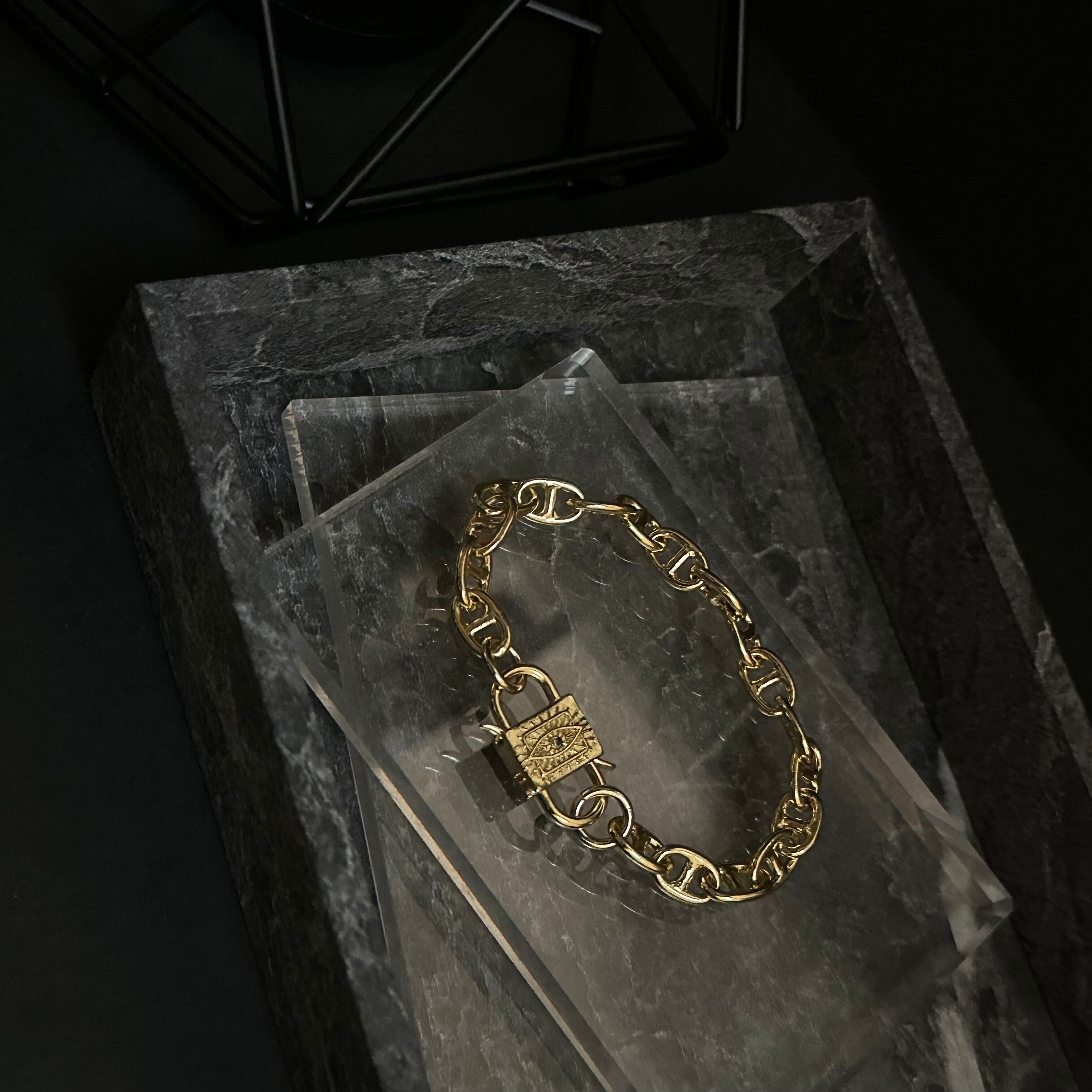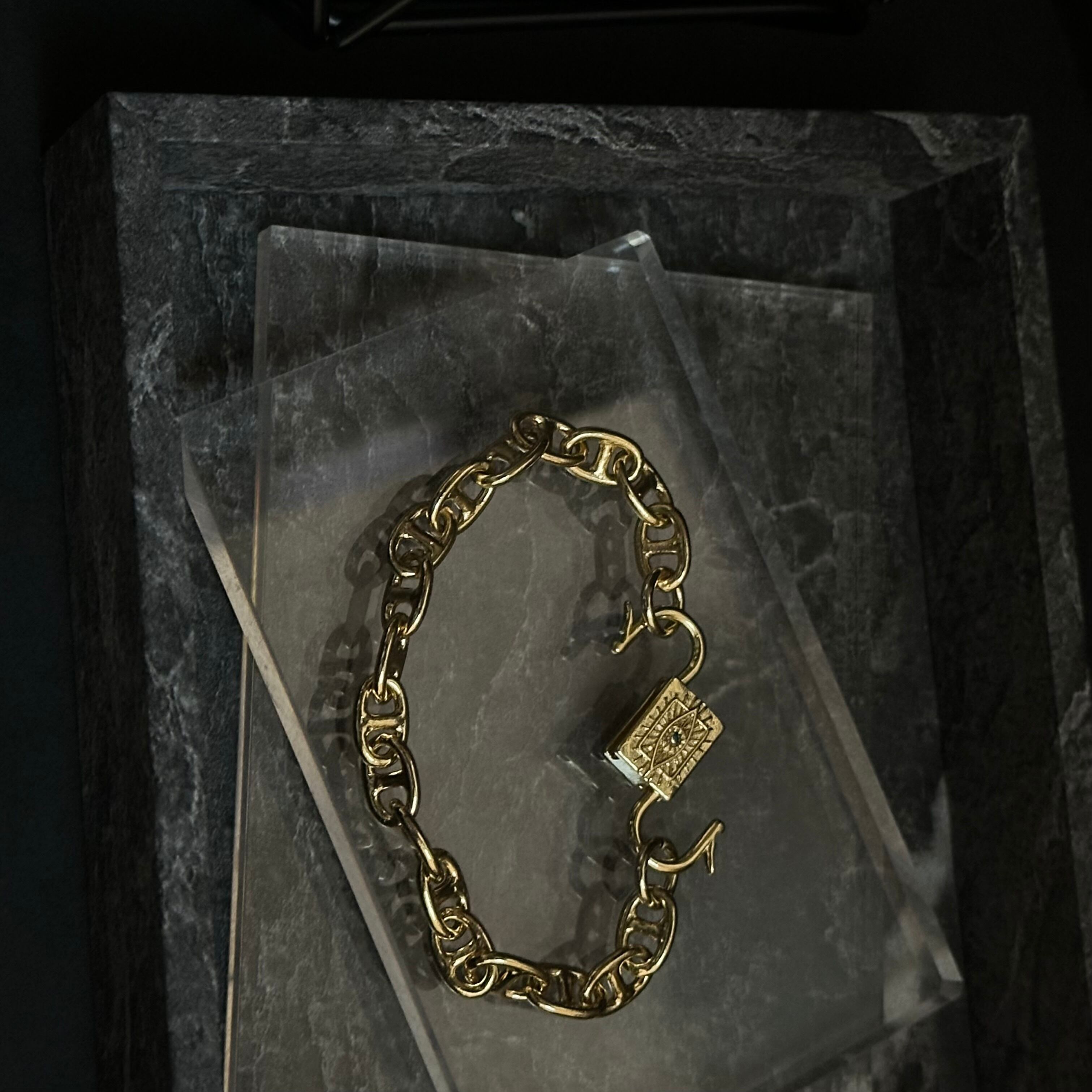 放射模様が刻まれた、南京錠モチーフのロックチャームを主役にしたブレスレット。