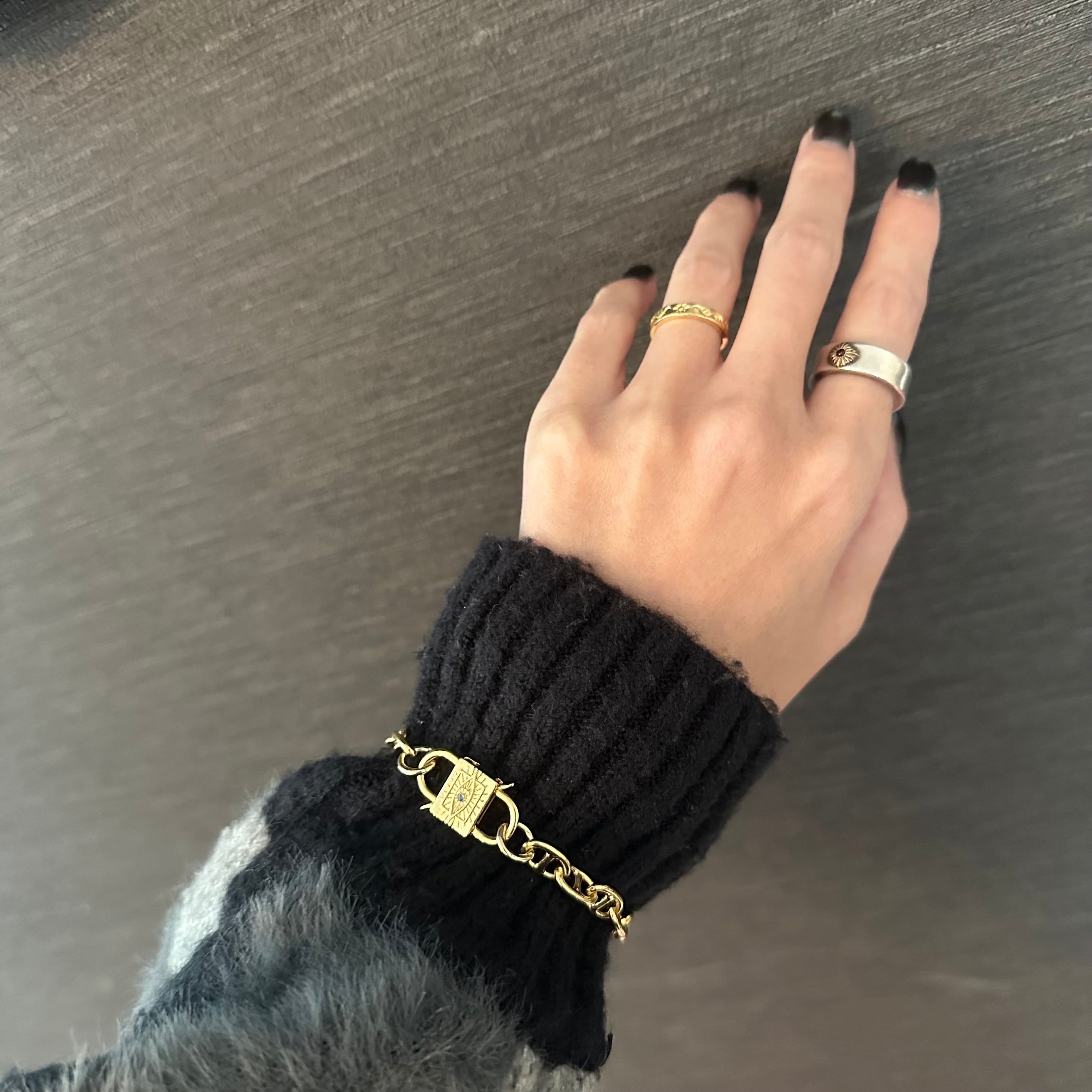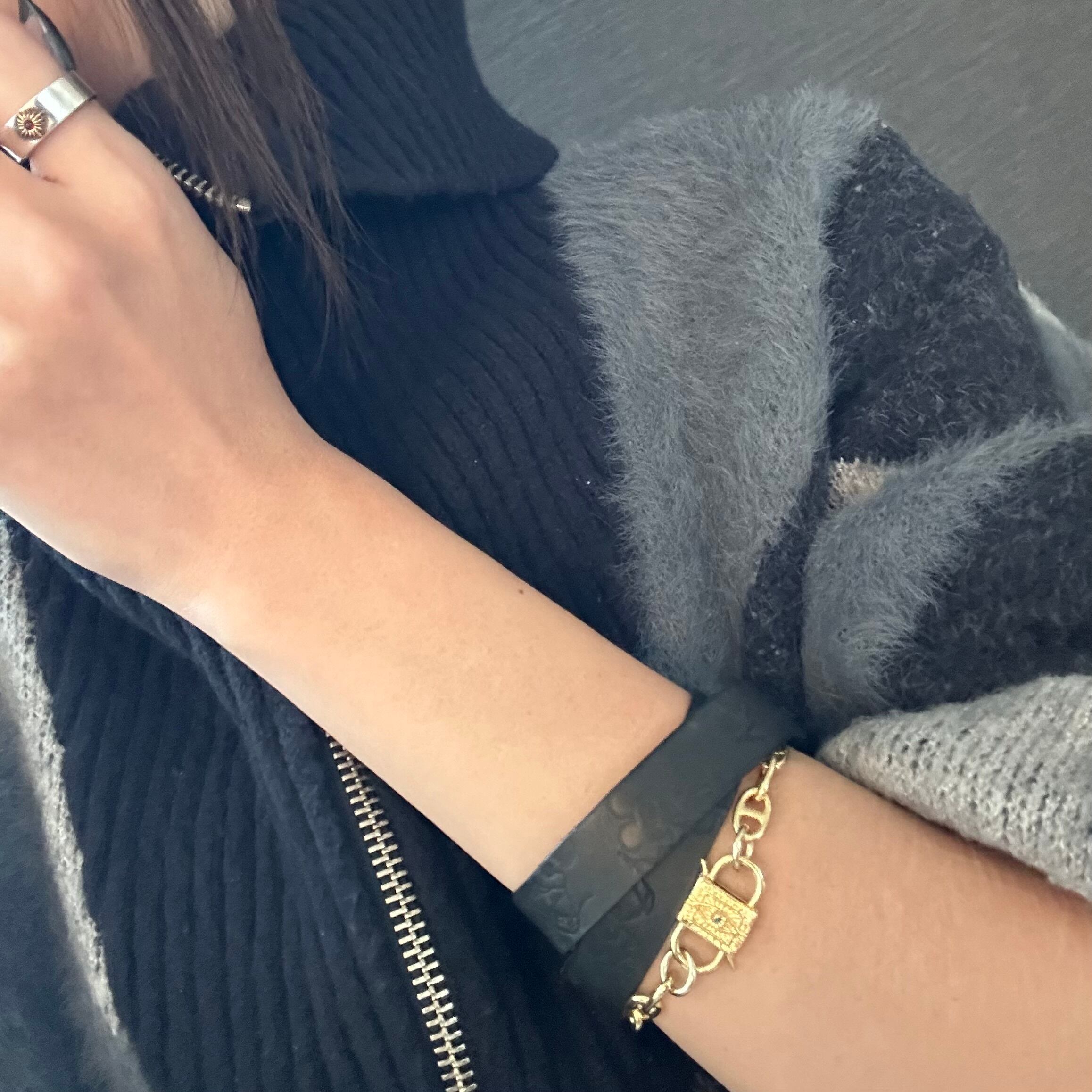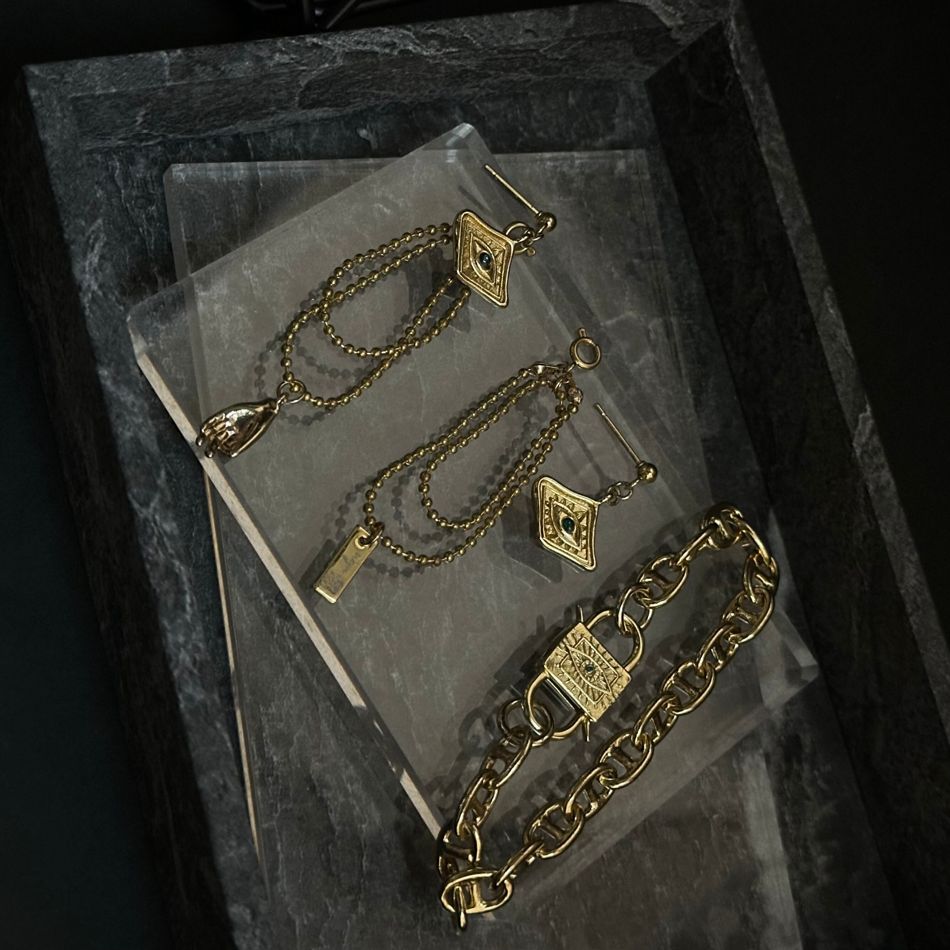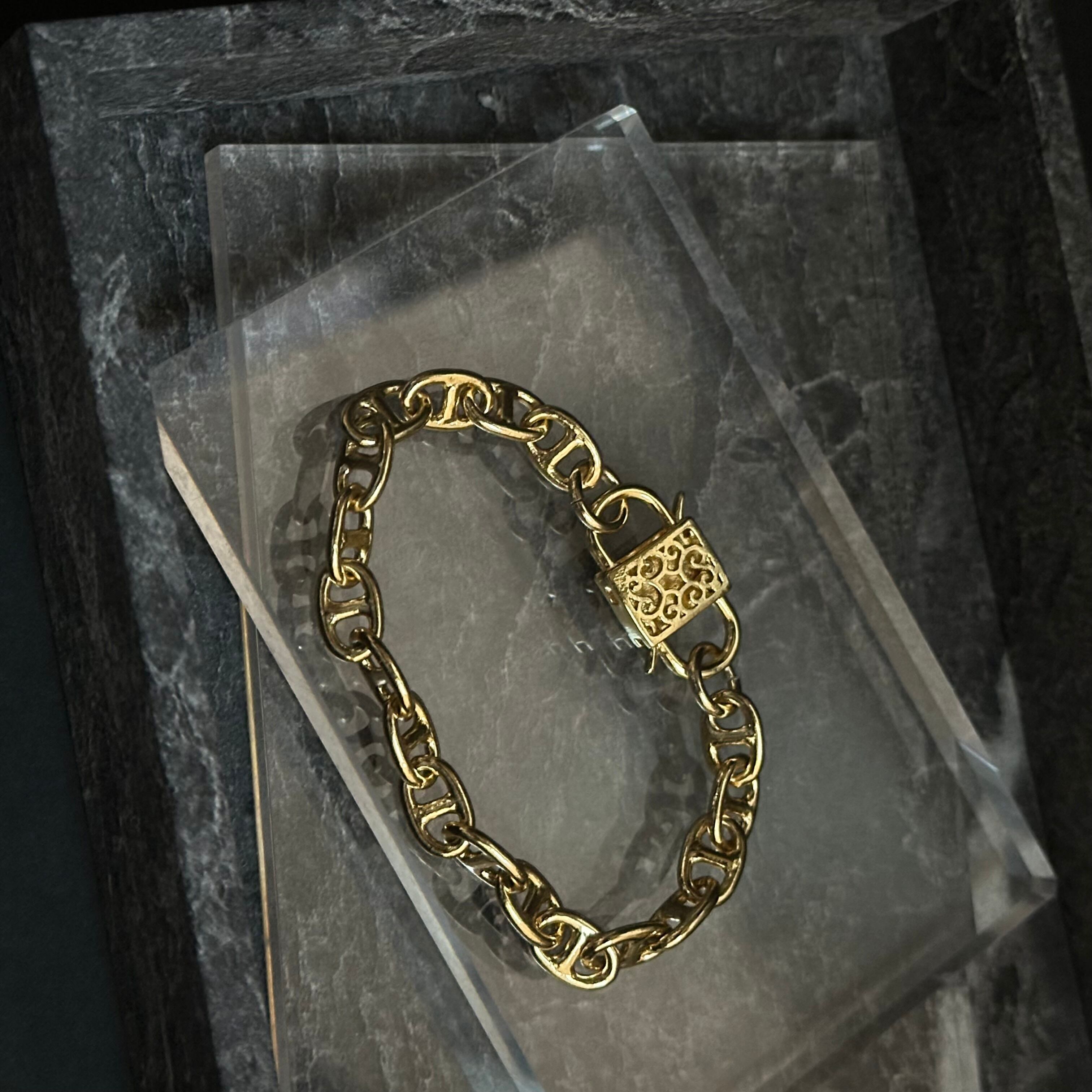 放射模様が刻まれた、南京錠モチーフのロックチャームを主役にしたブレスレット。